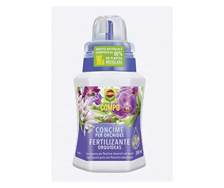 COMPO Concime per orchidee è il concime liquido organo-minerale ideale per le orchidee in vaso, da aiuola ed epifite. La sua speciale formulazione delicata e a bassa salinità è studiata appositamente per piante particolarmente sensibili. Gli elementi nutritivi favoriscono una fioritura rigogliosa e durevole.